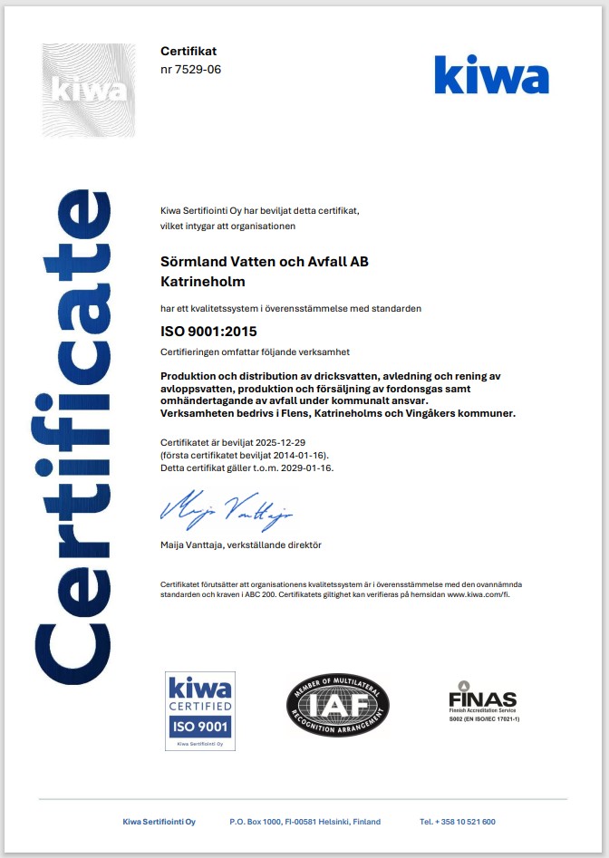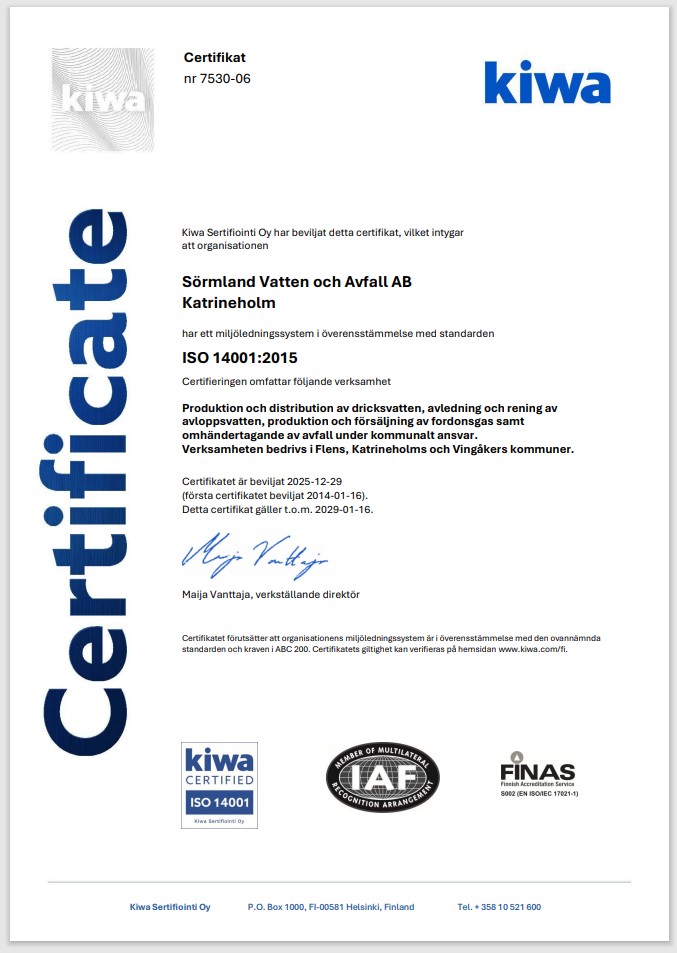 Sörmland Vatten och Avfall AB är sedan januari 2014 certifierat enligt kvalitetsledningssystemet ISO 9001 och miljöledningssystemet ISO 14001. Certifikaten omfattar produktion och distribution av dricksvatten, avledning och rening av avloppsvatten, produktion och försäljning av fordonsgas samt omhändertagande av kommunalt avfall. Verksamheten bedrivs i Flens, Katrineholms och Vingåkers kommuner.