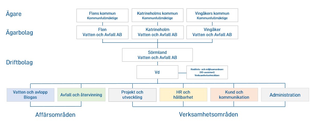Ägarna till Sörmland Vatten och Avfall AB är Flen Vatten och Avfall AB, Katrineholm Vatten och Avfall AB och Vingåker Vatten och Avfall AB.
